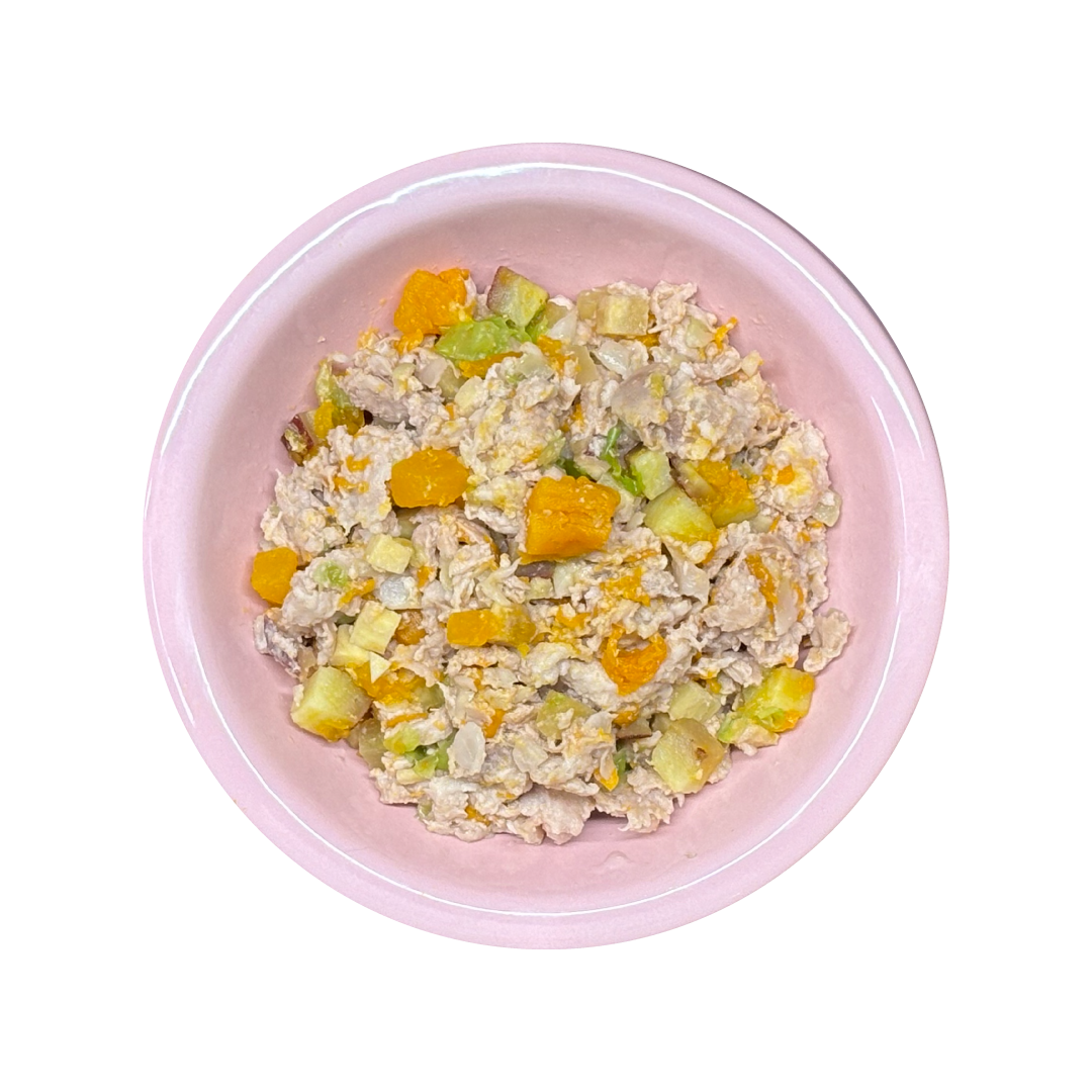 ※原材料:豚肉(国産)・ボーンブロス(国産豚骨スープ)・豚レバー(国産)・豚ハツ(国産)・かぼちゃ(国産)・サツマイモ(国産)・キャベツ(国産)・りんご(国産)・ゼラチン(国産)・ひまわり油・Ca・ミネラルブレンド・ビタミンD・羊腸